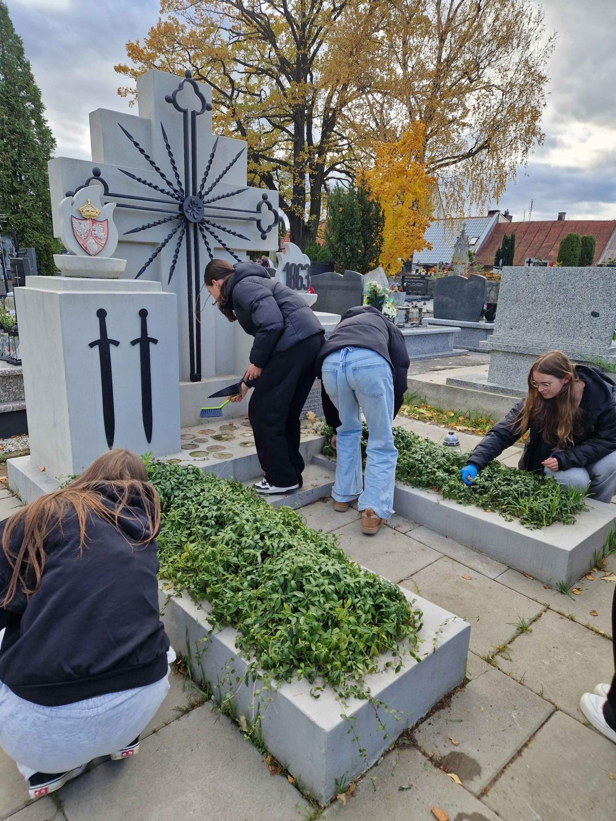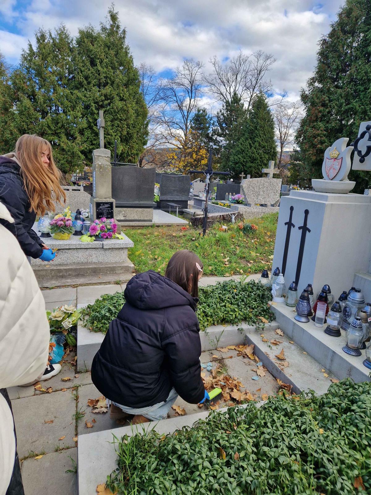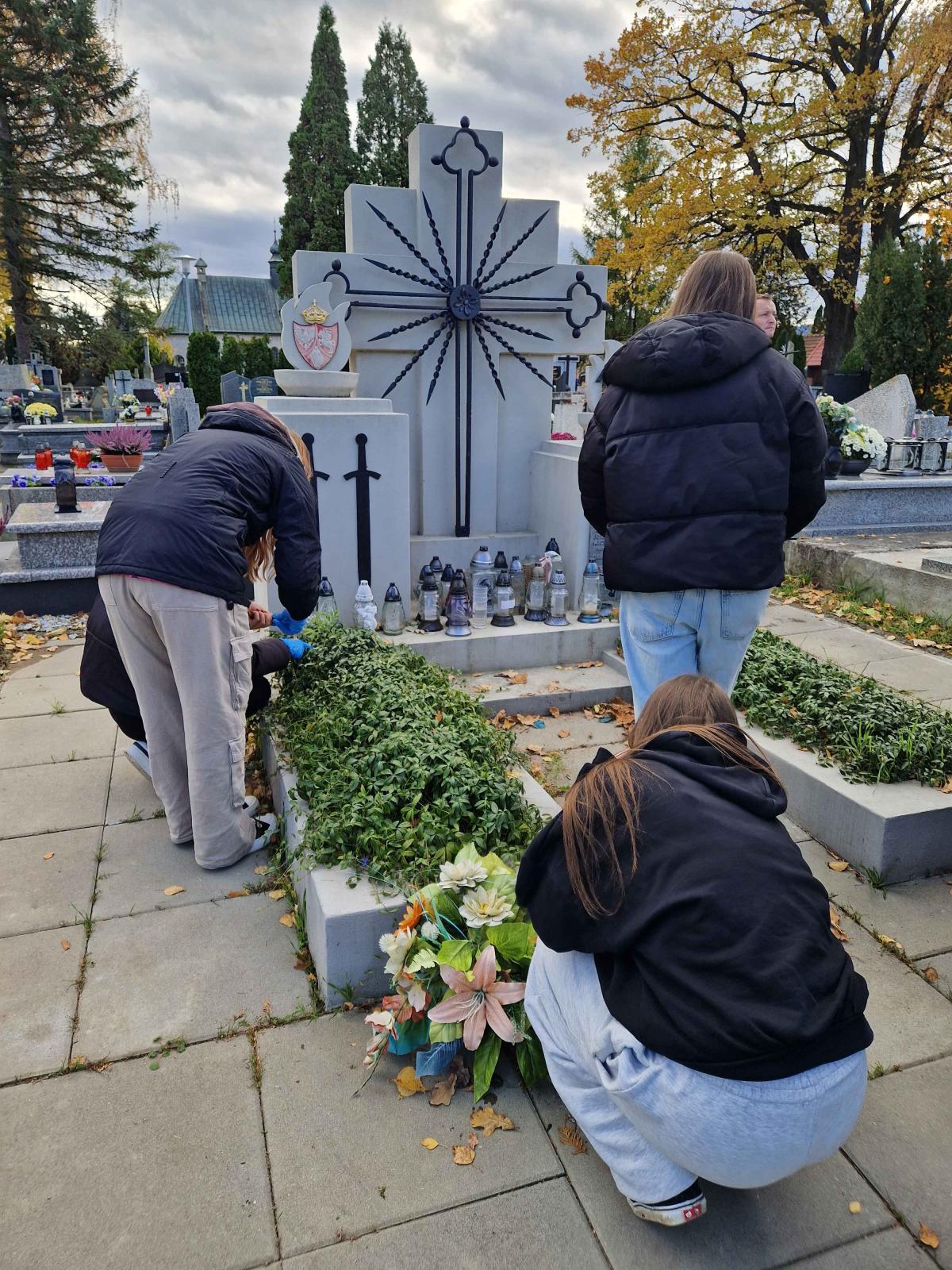 W dniu 27 października 2025 roku uczniowie klasy 1a wraz z opiekunem samorządu szkolnego, panią Martą Lelito, oraz nauczycielem wychowania fizycznego, panem Tomaszem Łabudą, odwiedzili cmentarz w Starym Sączu, aby uporządkować grób powstańców styczniowych.