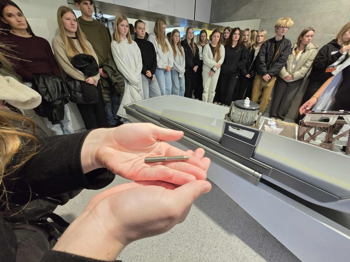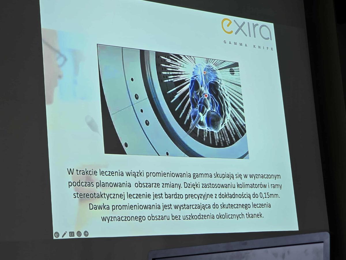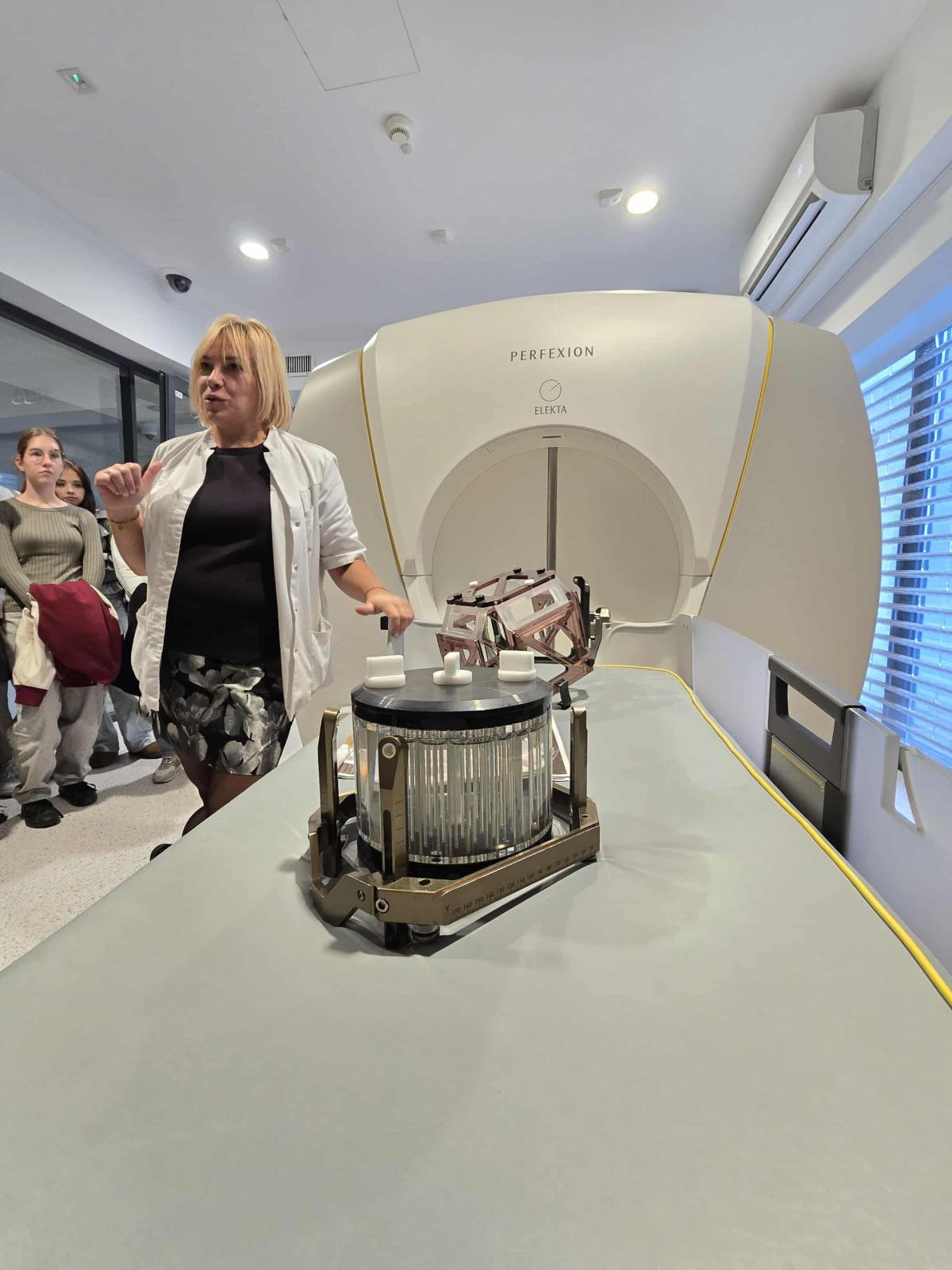 Jednym z głównych punktów wizyty było zapoznanie się z zasadą działania Gamma Knife – rewolucyjnej metody leczenia guzów mózgu, która wykorzystuje promieniowanie do precyzyjnego niszczenia nowotworów, eliminując konieczność tradycyjnego zabiegu chirurgicznego. Młodzież dowiedziała się, jak dokładnie działa ta przełomowa technologia, której precyzja w leczeniu jest porównywalna z umiejętnościami chirurga, ale bez użycia skalpela! To naprawdę wyjątkowe doświadczenie, które pokazało uczniom, jak zaawansowane technologie medyczne mogą zmieniać życie pacjentów na całym świecie.