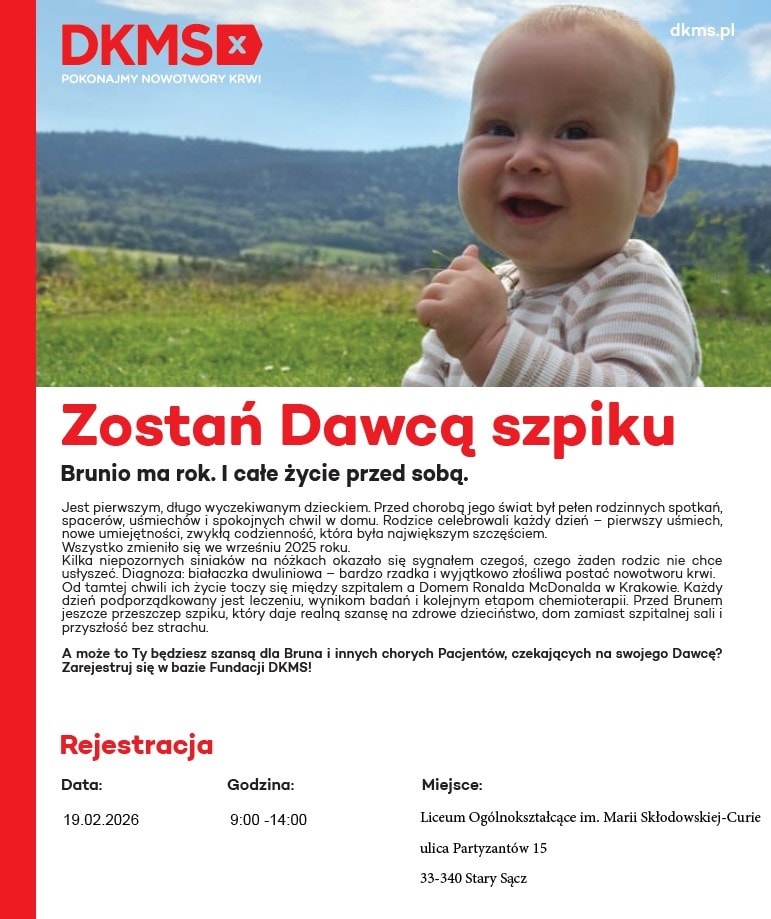 Wolontariusze Klubu Impuls pod opieką koordynatorki pani Anety Mamali zapraszają całą społeczność szkolną oraz mieszkańców okolicy do udziału w akcji rejestracji dawców DKMS dla Bruna – rocznego chłopczyka z Ptaszkowej, który zmaga się z ostrą białaczką dwuliniową.