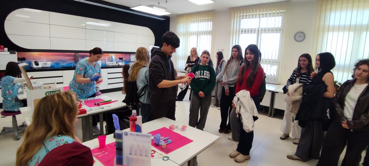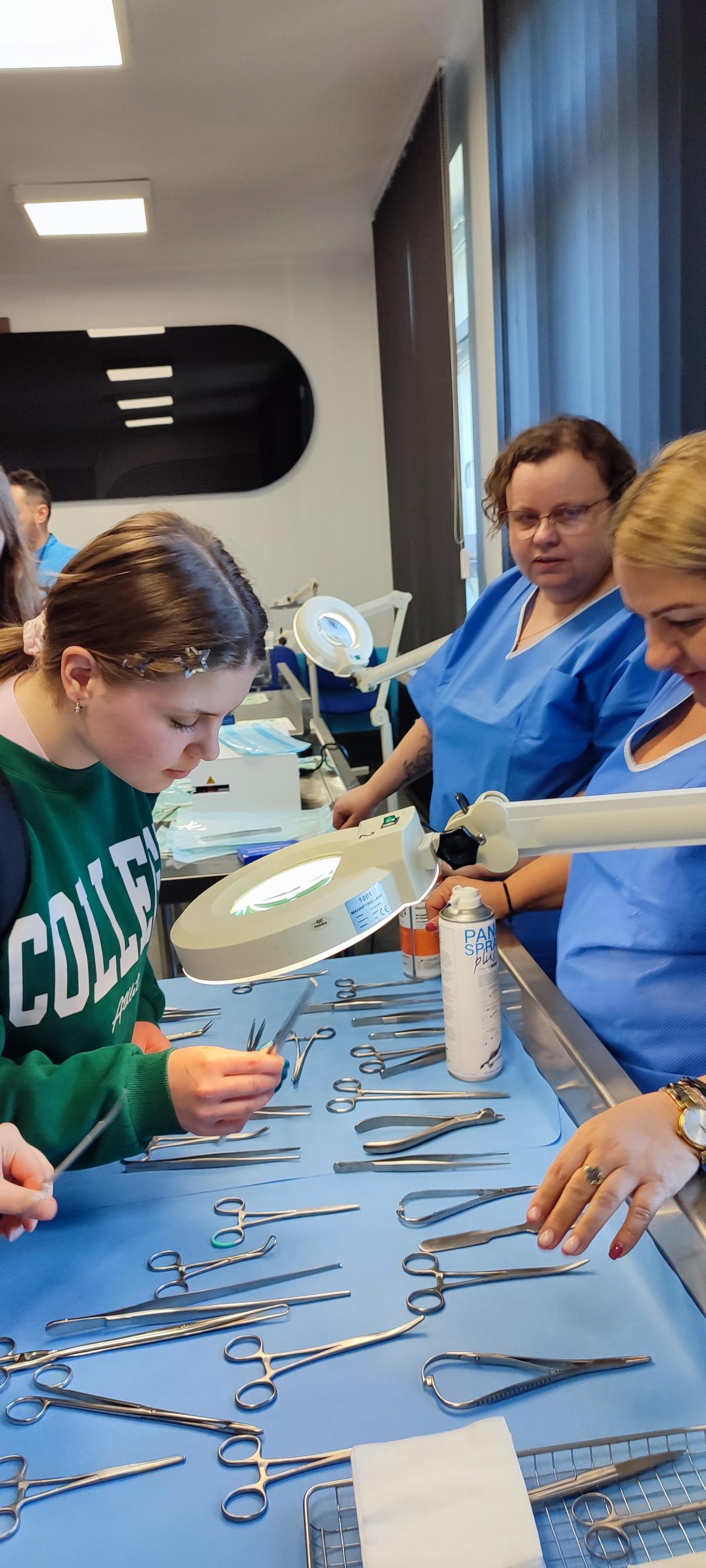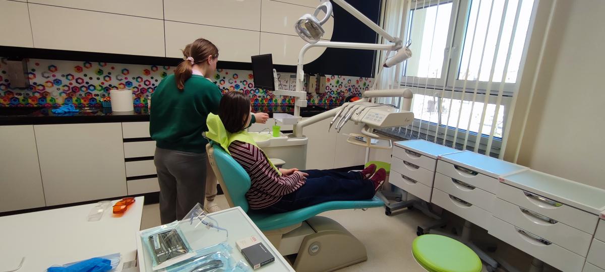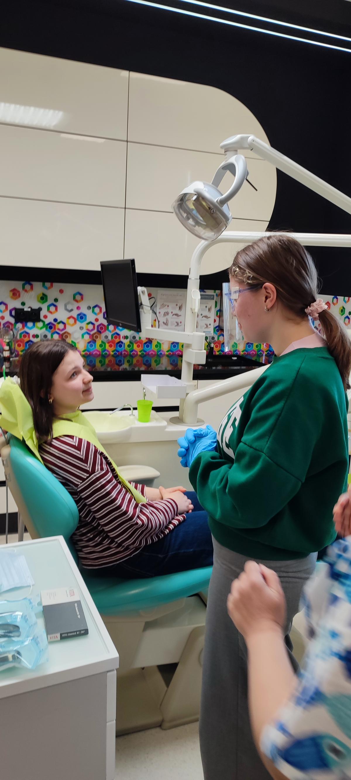 Dużym zainteresowaniem cieszyła się pracownia stomatologiczna, gdzie młodzież poznała przebieg zabiegów higienizacji zębów oraz specyfikę pracy asystentki stomatologa. Uczniowie mogli z bliska obejrzeć nowoczesne narzędzia medyczne oraz dowiedzieć się, jak wygląda organizacja pracy w gabinecie dentystycznym.