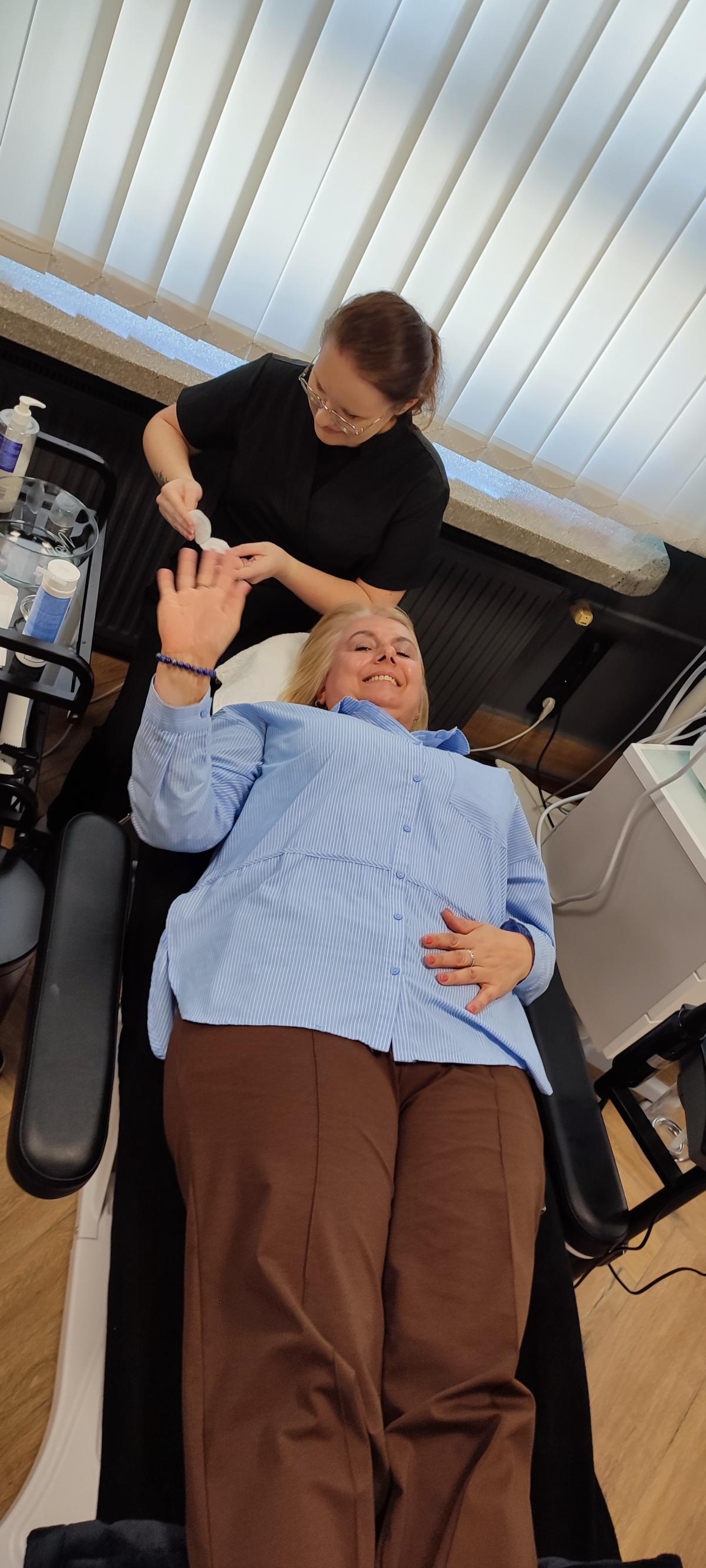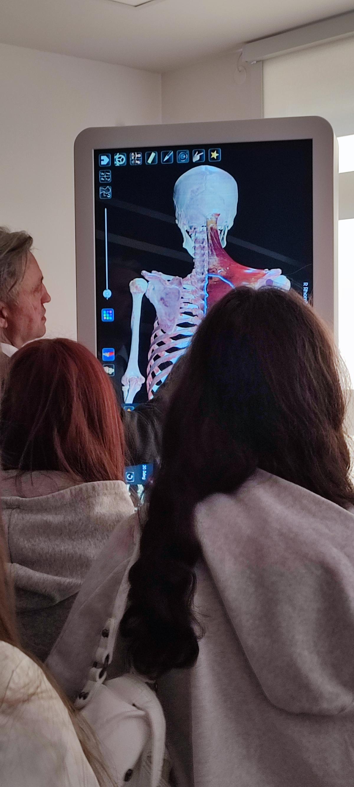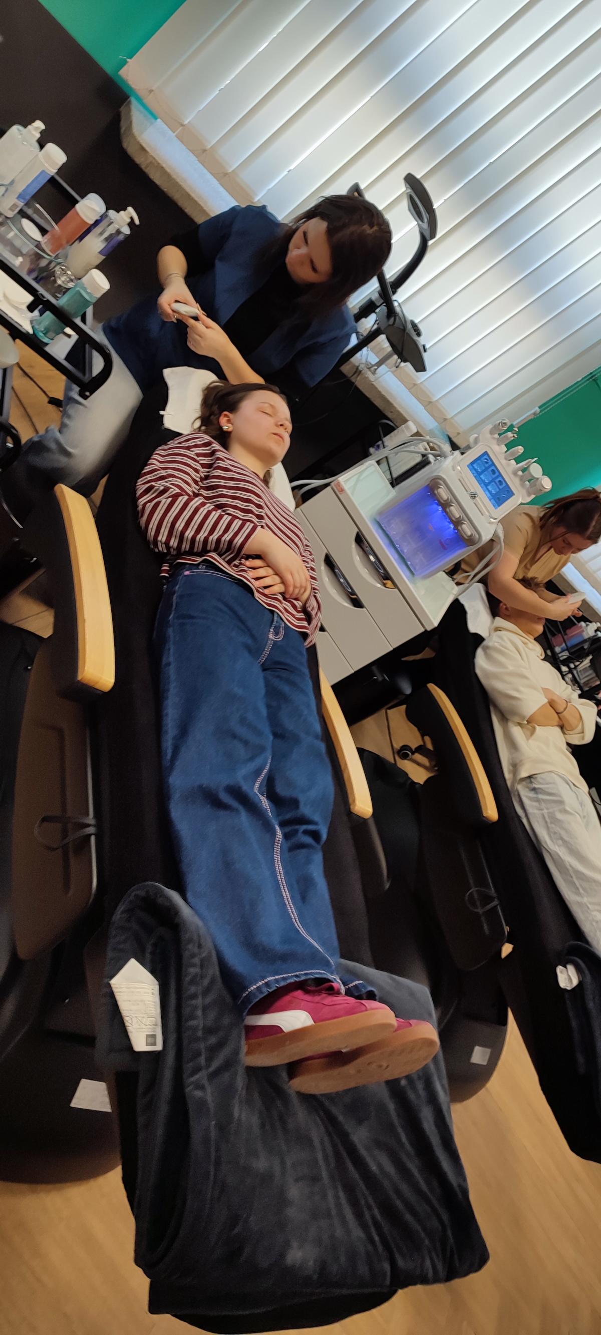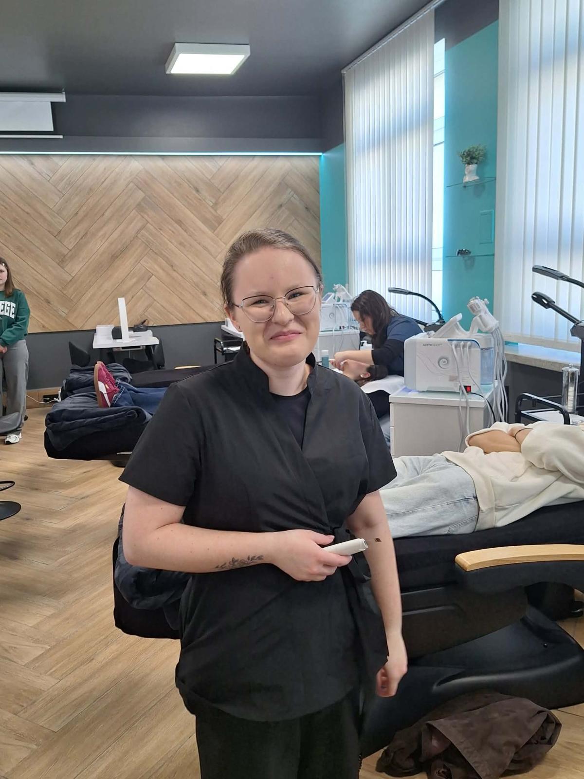 Nie zabrakło także aktywnego udziału w zajęciach praktycznych. Uczniowie uczestniczyli w zabiegach pielęgnacyjnych na twarz oraz masażach, poznając podstawowe techniki stosowane w kosmetologii i fizjoterapii. Mieli również możliwość zmierzenia ciśnienia tętniczego oraz wykonywania badania USG pod okiem specjalistów.