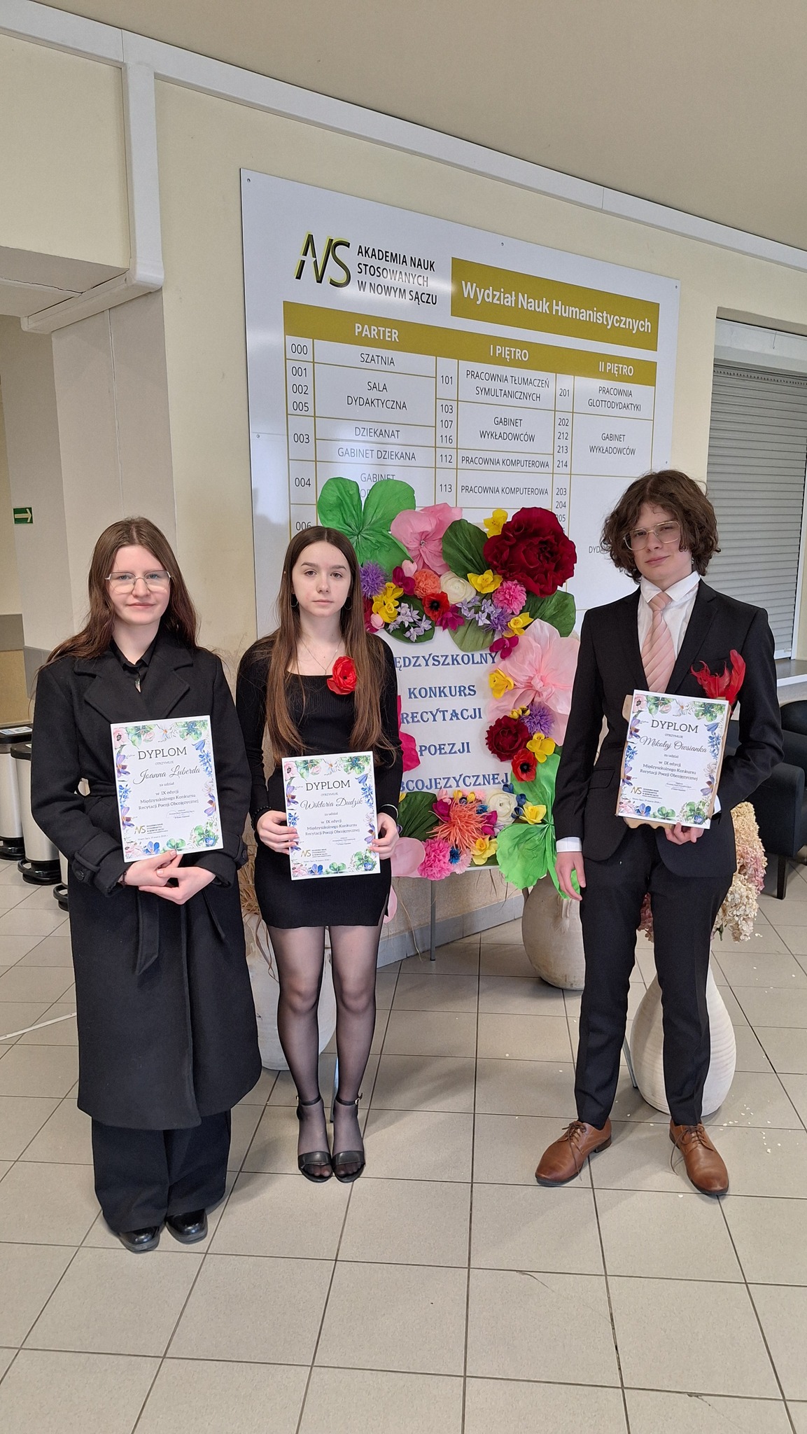19 marca uczniowie naszego liceum wzięli udział w IX edycji Międzyszkolnego Konkursu Recytacji Poezji Obcojęzycznej, organizowanego przez Wydział Nauk Humanistycznych Akademii Nauk Stosowanych w Nowym Sączu. Szkołę reprezentowali: Mikołaj Owsianka (kl. 2B), Joanna Luberda (kl. 1C) oraz Wiktoria Dudzik (kl. 1B).