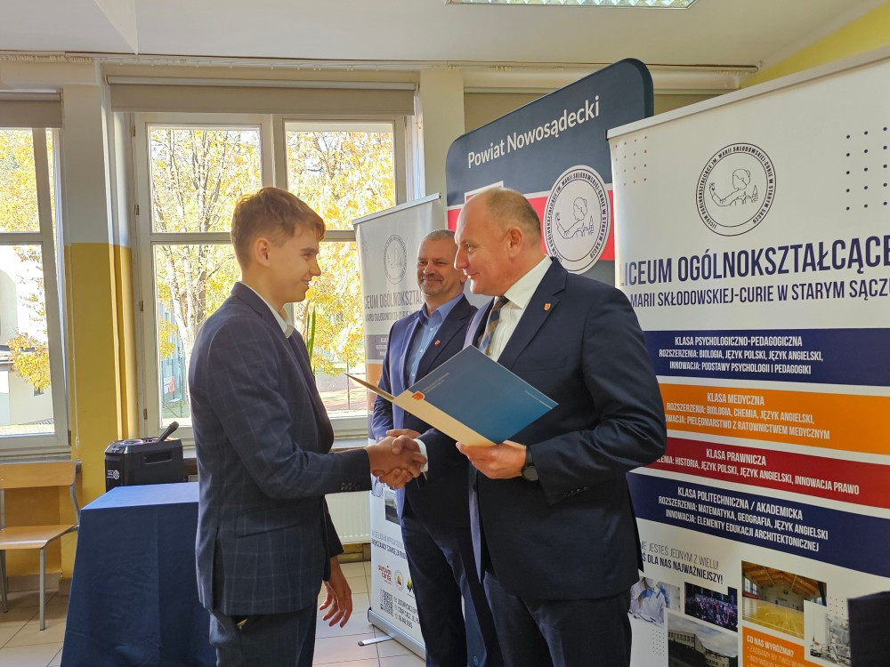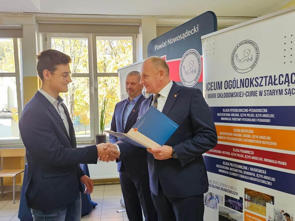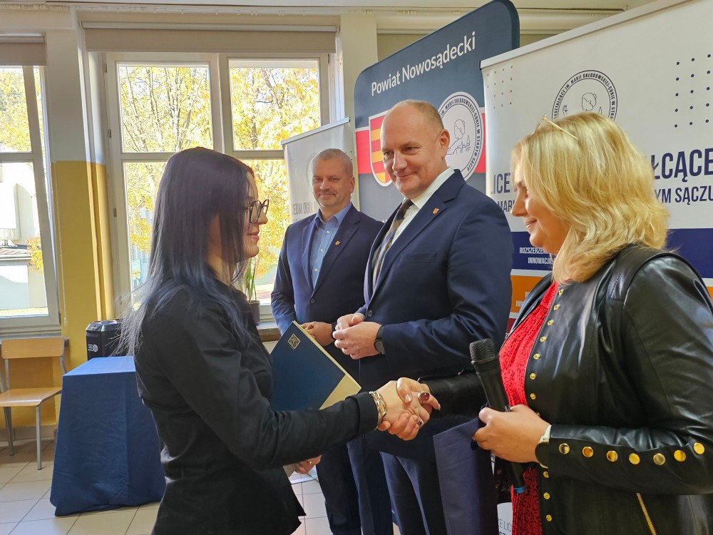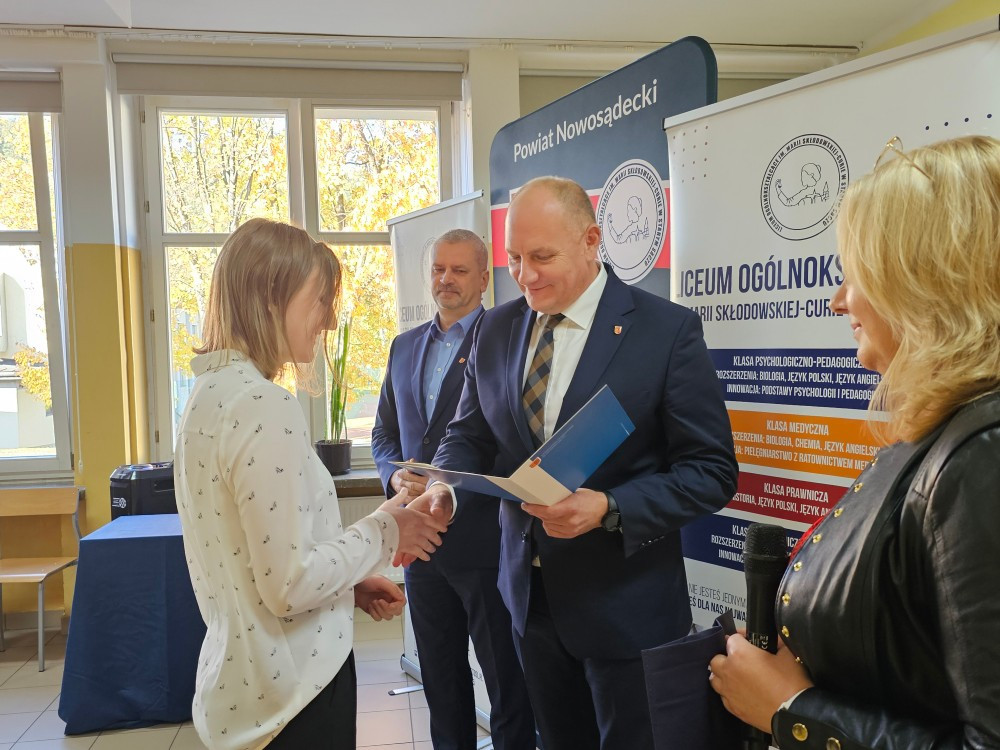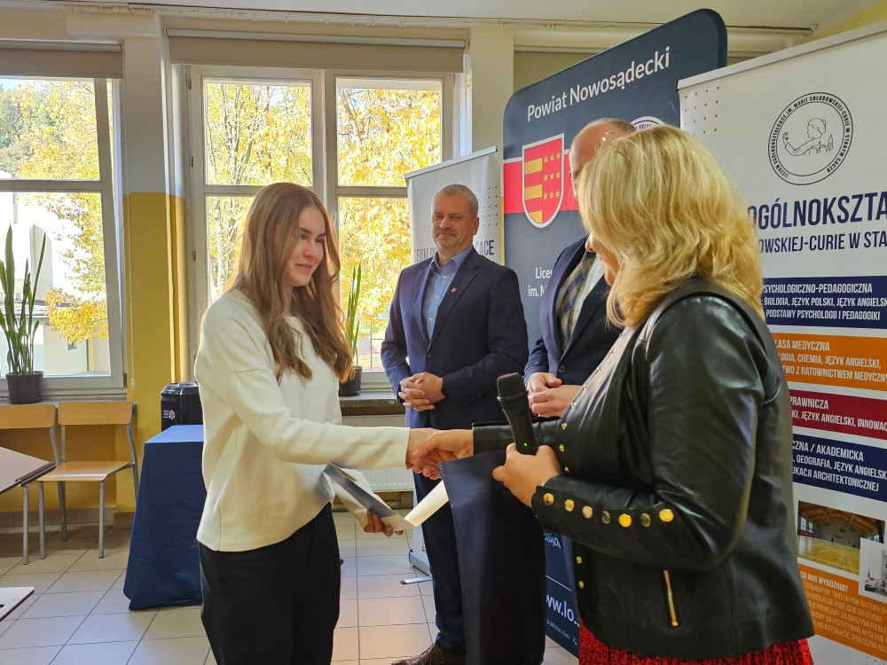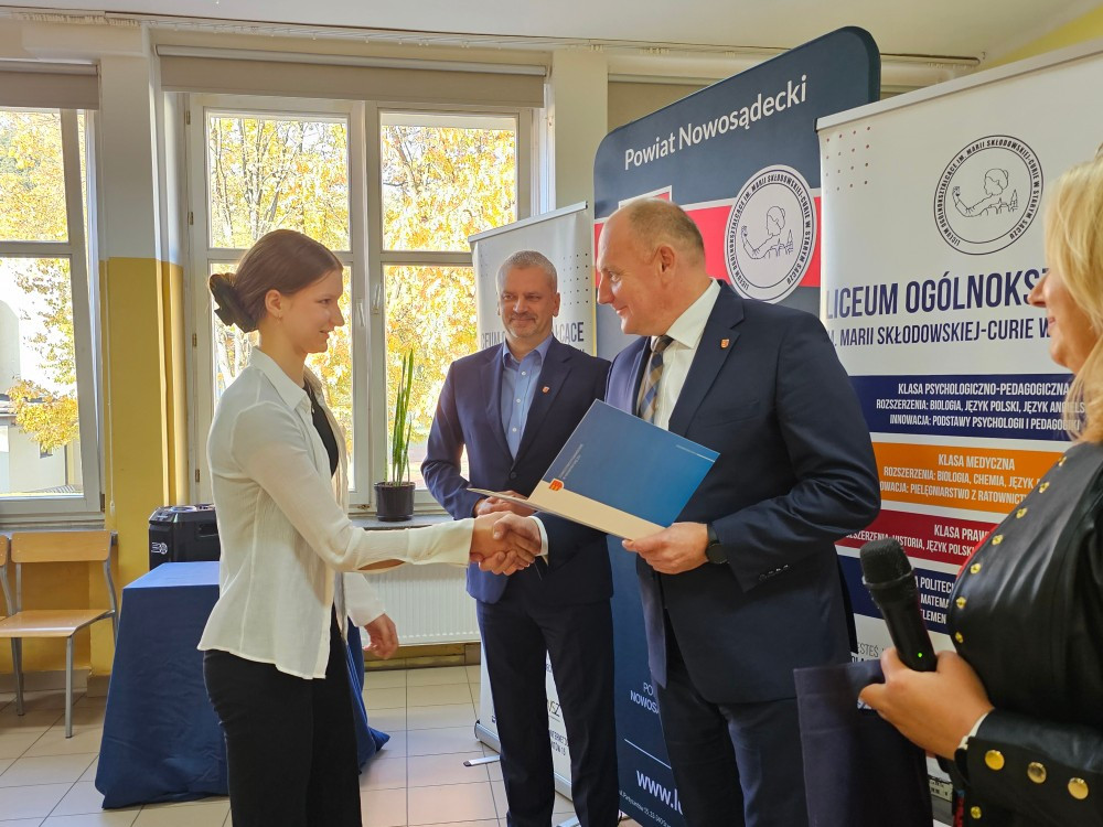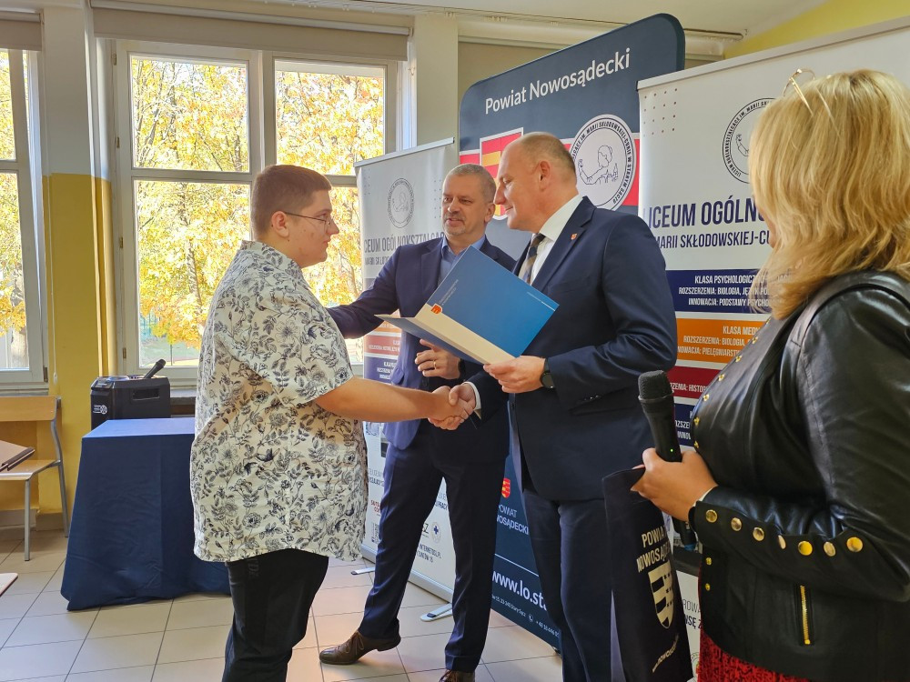 Dnia 22 października Starosta Powiatu Nowosądeckiego pan Tadeusz Zaremba wręczył stypendia naukowe najzdolniejszym uczniom. W tym roku nagrodę finansową odebrało 14 uczniów naszego liceum: Basta Kacper (3b), Borucka Julia (3a), Florian Hanna (2c), Janczura Ilona (3e), Jop Maciej (3c), Kozielec Kamila (3e), Krzak Paweł (2b),Kurnyta Kamila (2a), Leszko Ewelina (2b), Mikulec Maria (4b), Mikulec Witold (2a), Nowak Emilia (4a), Potok Krzysztof (3b) i Prusaczyk Anna (3b).