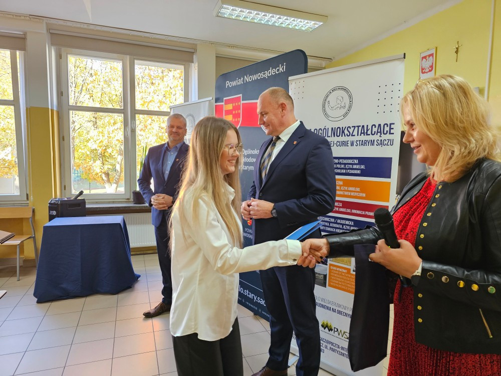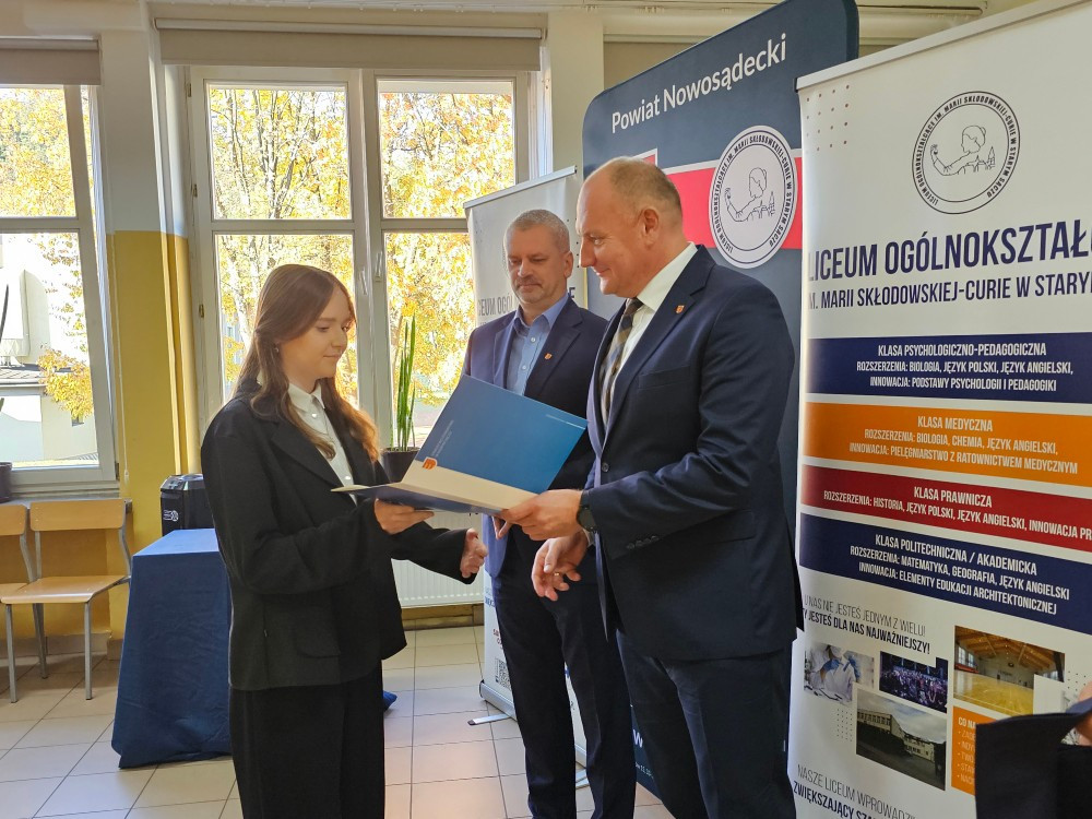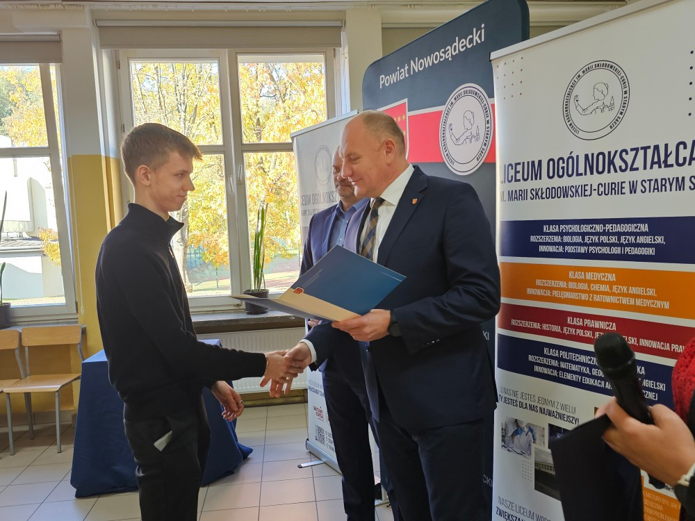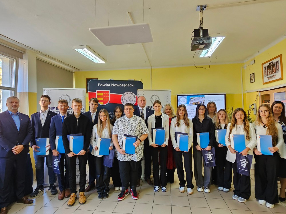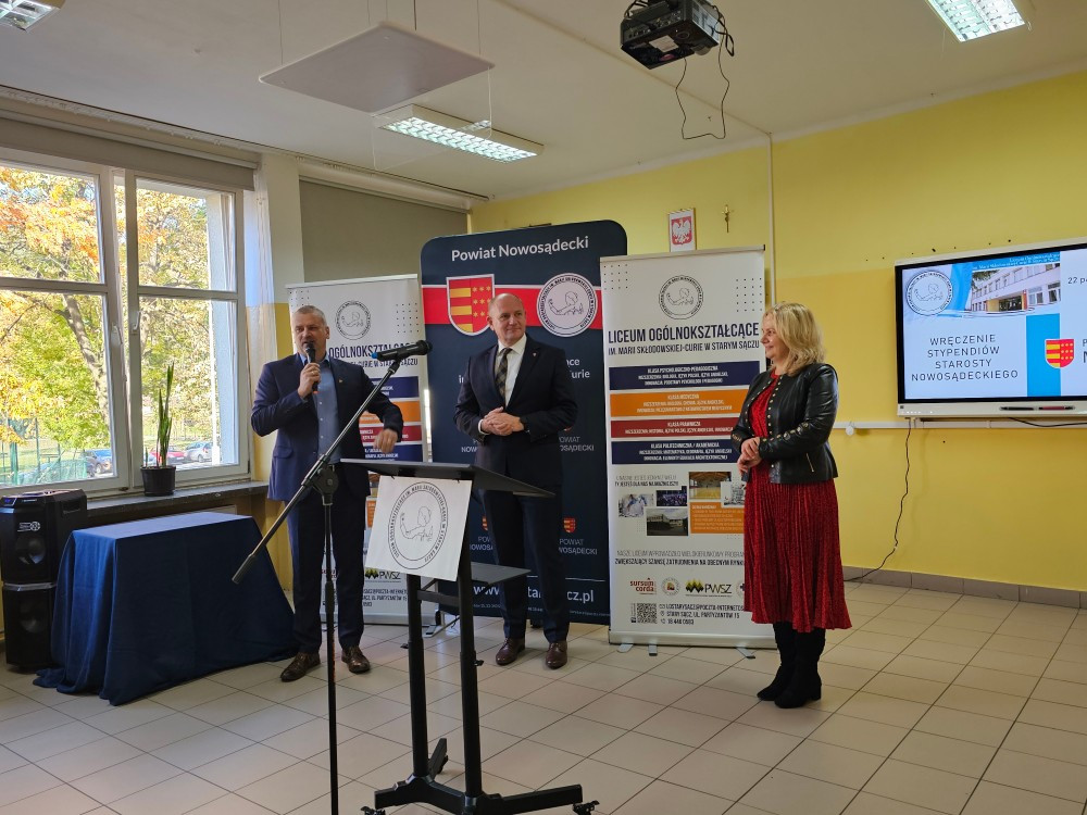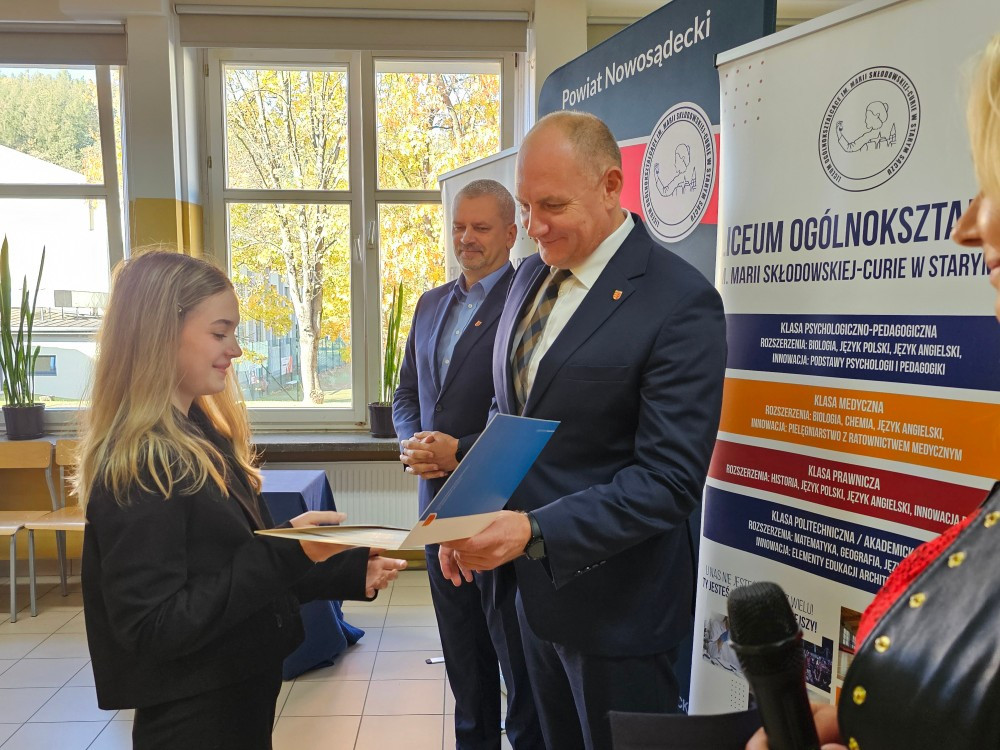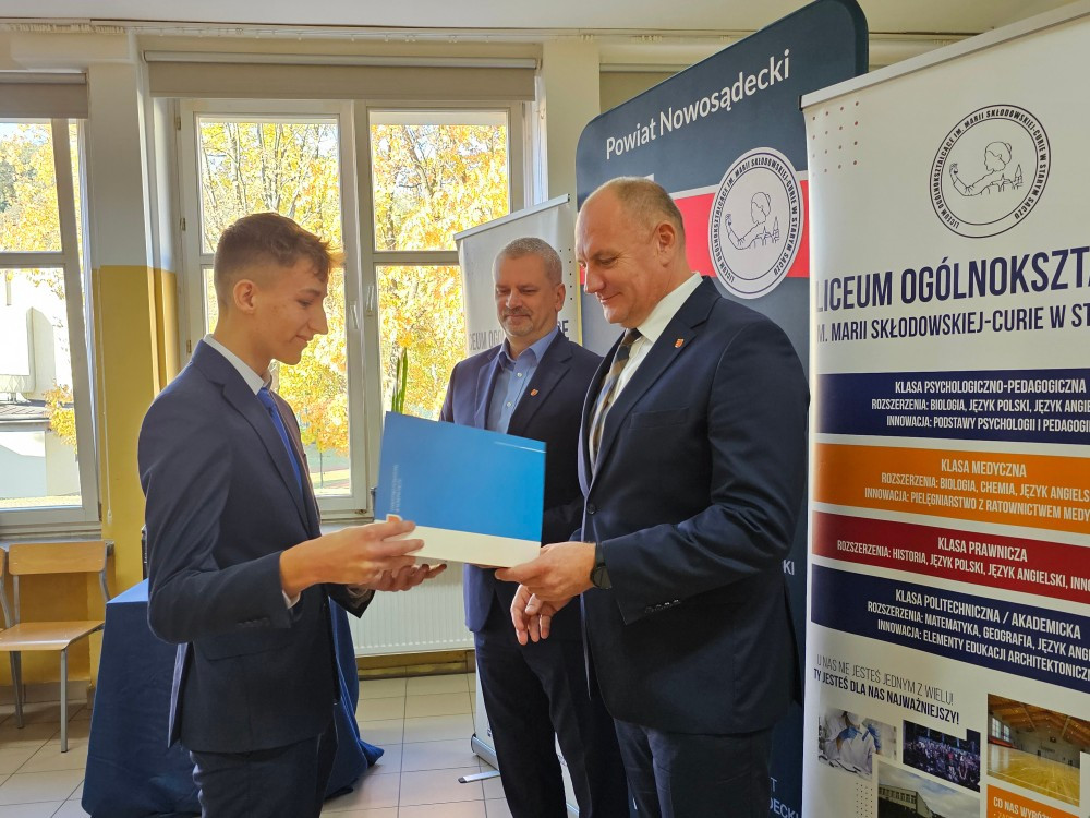 Dnia 22 października Starosta Powiatu Nowosądeckiego pan Tadeusz Zaremba wręczył stypendia naukowe najzdolniejszym uczniom. W tym roku nagrodę finansową odebrało 14 uczniów naszego liceum: Basta Kacper (3b), Borucka Julia (3a), Florian Hanna (2c), Janczura Ilona (3e), Jop Maciej (3c), Kozielec Kamila (3e), Krzak Paweł (2b),Kurnyta Kamila (2a), Leszko Ewelina (2b), Mikulec Maria (4b), Mikulec Witold (2a), Nowak Emilia (4a), Potok Krzysztof (3b) i Prusaczyk Anna (3b).