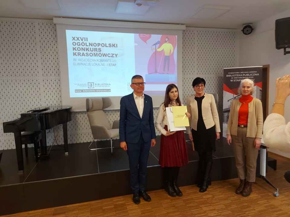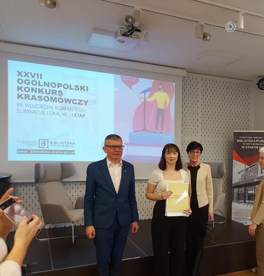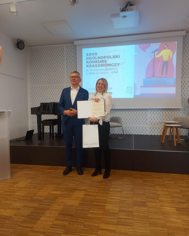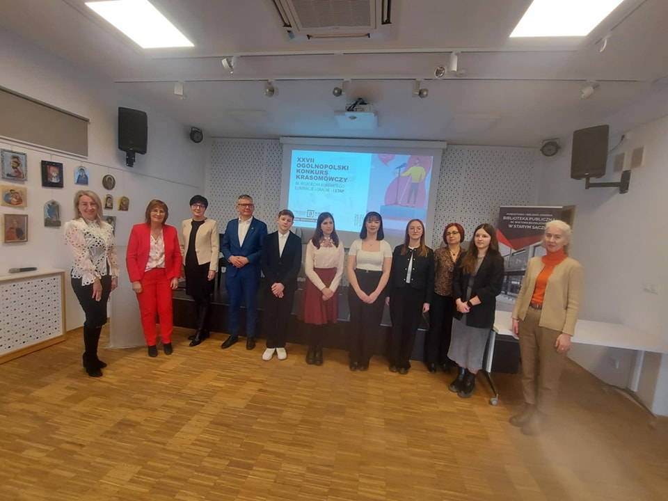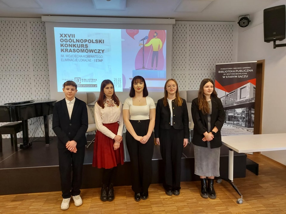 Na uroczystej gali, która odbyła się 28 lutego w Powiatowej i Miejsko Gminnej Bibliotece Publicznej w Starym Sączu Aleksandra Ogorzały z klasy 4c oraz Patrycja Komenda z klasy 3e otrzymały nagrody z rąk Pana burmistrza Jacka Lelka, który był pod ogromnym wrażeniem dojrzałych treści, które były zawarte w wygłoszonych mowach na temat: ,,... żeby wrócił świat mowy czystej, świat słów mówiących...". Pan Burmistrz zwrócił uwagę, iż obecna rzeczywistość zubaża język i takie działania, jak ten Konkurs stoją na straży czystości mowy. Cytat Ludwiga Wittgensteina: ,,Granice mojego języka wyznaczają granice mojego świata", który został przywołany na zakończenie mowy Pana burmistrza powinien być hasłem przewodnim każdego z nas.