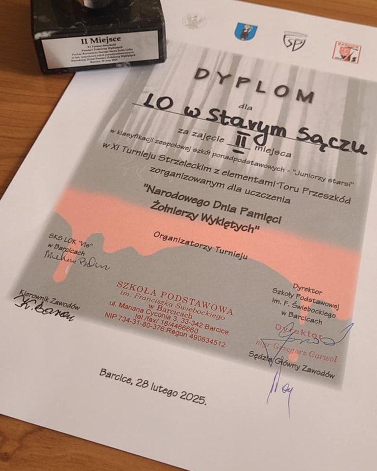 28 lutego 2025 roku w Szkole Podstawowej im. Franciszka Świebockiego w Barcicach odbył się XI Turniej Strzelecki upamiętniający Narodowy Dzień Pamięci Żołnierzy Wyklętych. Nasza drużyna w składzie Nadia Skoczeń, Mariola Biryt i Klara Kurzeja zajęła II miejsce.